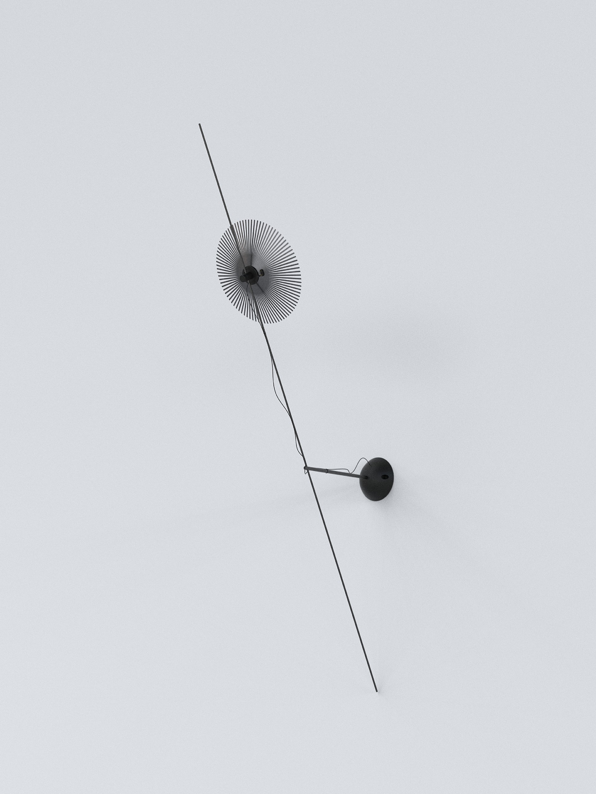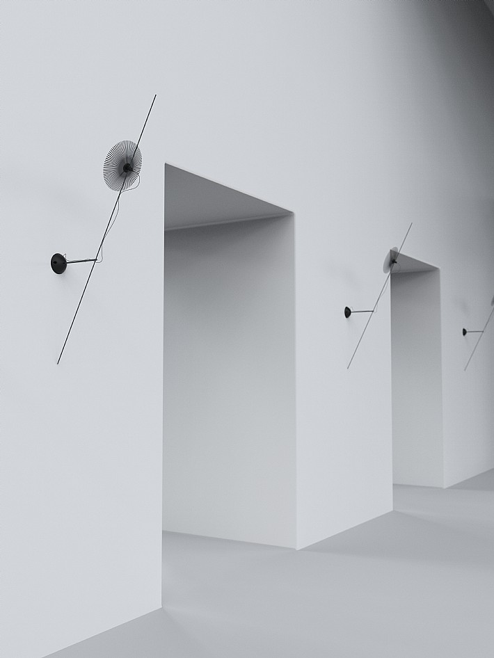 Harper Flag  壁灯的灵感来自欧洲古堡与历史建筑中斜向伸出的旗杆,将一根斜着的线引入室内空间,使其既带有轻微的诗意,也像一朵从墙上生长出来的花。作品以极为轻盈的结构展开,借由线条自身的重力轻轻抵住墙面并完成固定,看似脆弱,却十分稳定。它尤其适合在走廊或连续墙面中以阵列方式出现,重复的斜线与光晕会在空间中形成安静而清晰的节奏。